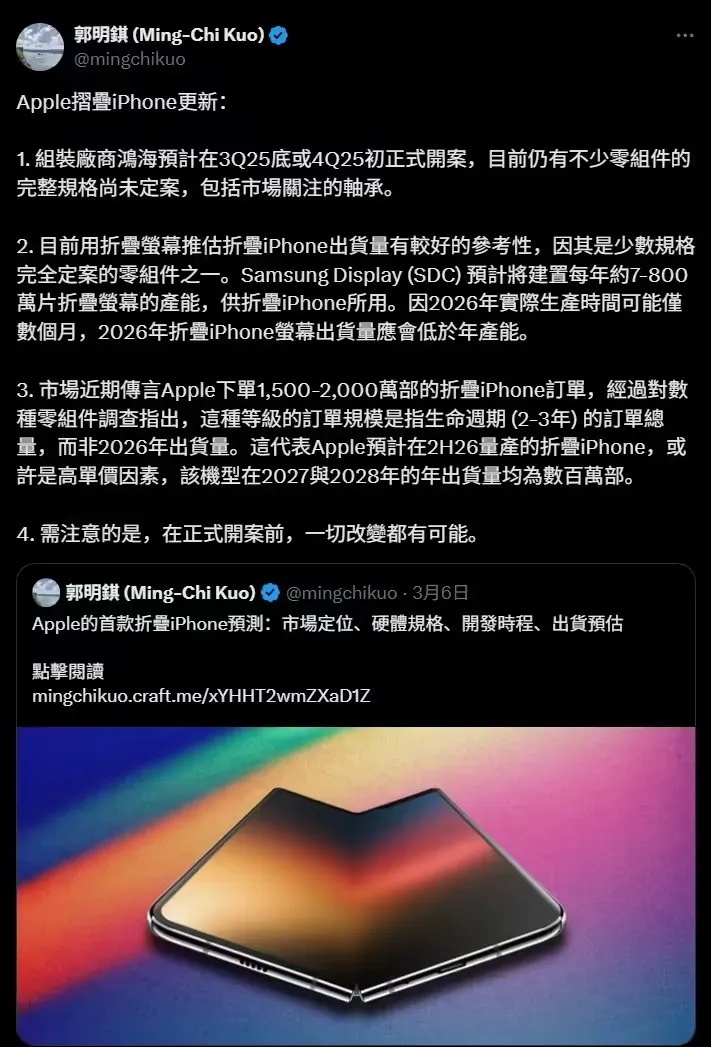 郭明錤预计,三星显示器公司将在2026年为苹果生产约700万至800万块折叠屏面板,而苹果计划总共订购1500万至2000万部折叠屏iPhone。他推测,这1500万至2000万部折叠设备可能需要支撑苹果两到三年的市场需求,因为该智能手机高昂的价格可能会限制其需求。